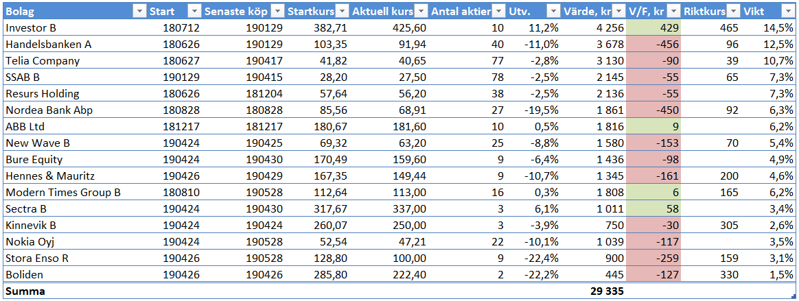 Maj månad slutade inte speciellt bra, minus 7%. Däremot började juni desto bättre. Portföljen är hittills ned 1 549 kronor men på det stora hela (innan omstöpningen av portföljen) upp 7,56% eller 3 873 kronor på helåret. Under maj köptes Nokia, MTG och Stora Enso.