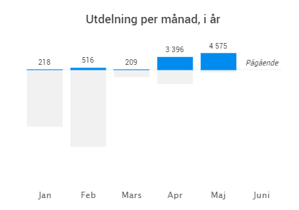 I maj landade 4 575 kronor in på kontot i form av utdelningar. Det är dessutom min starkaste månad hittills och kommer antagligen alltid att vara det. Det är en ökning av utdelningarna med 6 559% i jämförelse med samma period föregående år. =) Men nu är det ju så att jag inte hade speciellt mycket aktier vid det tillfället.