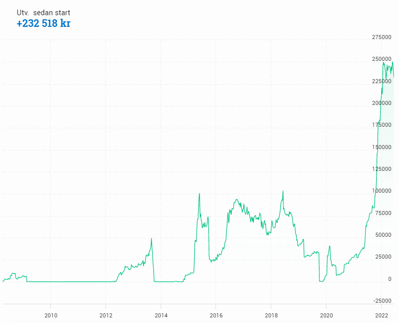 Så mellan 2020 till slutet av 2021 har det mer eller mindre gått spikrakt uppåt förutom nu sedan början av 2022. Det som har hållit kapitalet kring 250 000 kr är nya insättningar. Dessa har kommit från alla möjliga olika håll. Bland annat tillverkade jag Ethereum ett tag som jag sålt av och investerat här, sålt miningriggen och andra saker som bara legat och samlat damm.