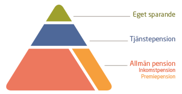 Den övre delen (grön), eget sparande, är alternativet som vi kan välja att ha eller inte ha. Vill vi ha den delen så krävs det att vi startar ett eget sparande. Min målsättning är att få en pyramid vars gröna del är betydligt större en bilden ovan. Pensionssystemet i sig kommer inte att kunna hjälpa oss att nå upp till den lön vi har idag (om man nu inte har en väldigt hög lön alternativt gjort väldigt bra placeringar). Det vi kan räkna på är att i bästa fall få behålla en pension som motsvarar cirka 80% av slutlönen men i en del fall ner mot 50-60% av slutlönen. Det går att göra prognoser på min pension om man är nyfiken kring vad den säger. Dock är osäkerhetsfaktorn kring den prognosen relativt stor.